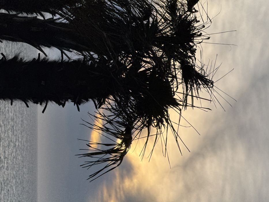 The image displays a coastal landscape in Anapa, Russia, at what appears to be sunset or sunrise. In the foreground, multiple dark, silhouetted palm trees occupy the left and central portions of the frame. Their prominent trunks exhibit textured surfaces, and their dense fronds, some appearing spiky and tangled, are sharply defined against the illuminated sky. The sky above features a band of intense orange and yellow light along the horizon, transitioning upwards into an expanse of grey and white clouds. Below the horizon, a body of water, consistent with the Black Sea, extends across the lower right section of the image, displaying faint ripples on its surface. No individuals or man-made objects are present in the scene.