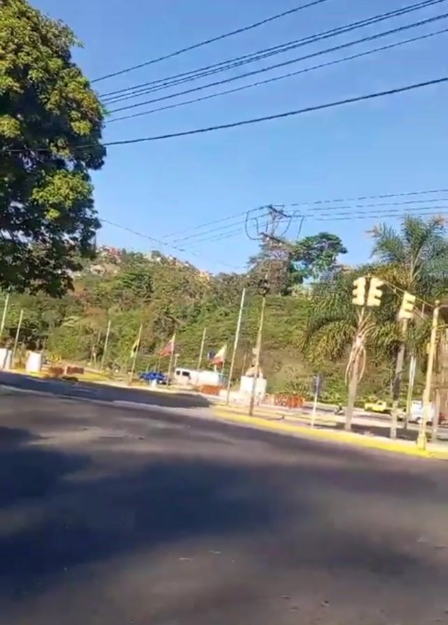 The camera pans to a green traffic light at an intersection in what appears to be a tropical location. The intersection is lined with palm trees and flags, and there is a hillside in the background. Cars are visible driving through the intersection. The sky is blue and clear.