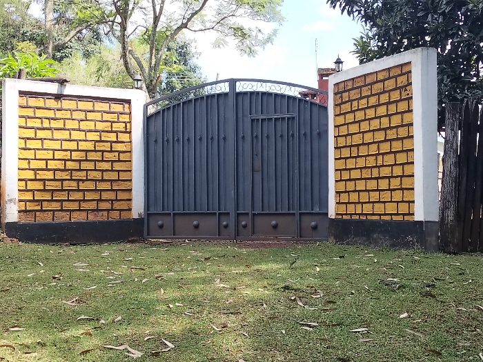 The scene depicts the entrance to a property in Nyansiongo ward, Kenya. A closed, dark grey, double-leaf metal gate with a curved top and decorative ironwork occupies the central frame. An integrated pedestrian door is visible on the right leaf of the main gate. The gate is flanked by two rectangular wall sections, each featuring a prominent yellow-ochre brick pattern with dark mortar lines, framed by white plaster pillars. The base of the gate and wall sections is dark grey. In the foreground, a vibrant green lawn is covered with scattered dry leaves. The background consists of dense green foliage and trees on the left. To the right, beyond the gate, a building with a red-tiled roof, a chimney, and an antenna is partially visible against a light blue sky with some cloud cover. No individuals or discernible activities are present.