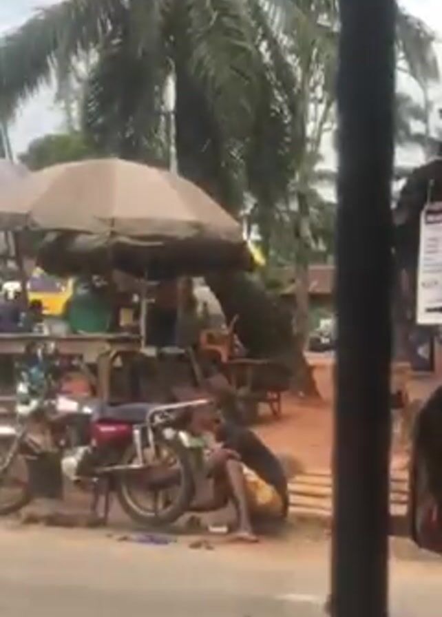 The video depicts a street scene in what appears to be a tropical or subtropical region. A tall, leaning palm tree dominates the background. In the foreground, two motorcycles are parked near a roadside stall shaded by a large umbrella. A person is kneeling and working on one of the motorcycles. Another person in a patterned shirt walks past the camera, partially obscuring the view. A small yellow auto-rickshaw is visible behind the stall. The ground appears to be reddish dirt.