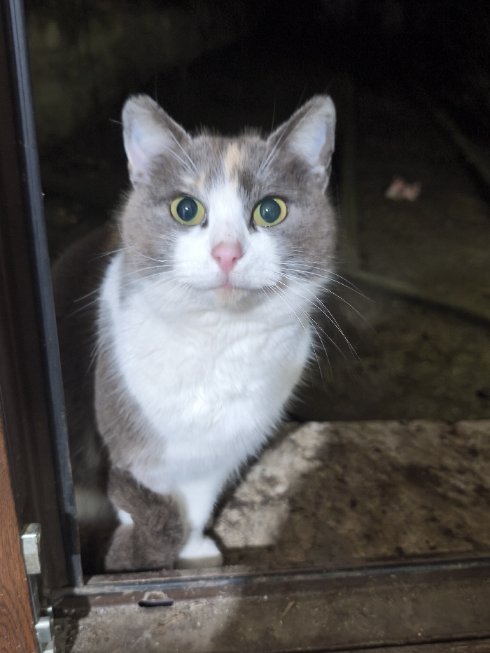 The image depicts a dilute calico cat located in Avren, Bulgaria. The cat features a white chest and face, with grey fur on its head, back, and front legs, and subtle light orange patches on its forehead and upper left side of its head (viewer's perspective). Its eyes are large, round, and green, exhibiting retroreflection from a direct light source. The nose is pink. Long white whiskers extend from both sides of its muzzle. The cat is positioned within an open doorway or frame; a dark brown frame with a silver metal hinge is visible on the left. The surface directly beneath the cat is a dark, textured material, possibly concrete or packed earth, containing some debris. The background is dark and out of focus. The cat is oriented forward, with its gaze directed directly towards the viewer/camera.