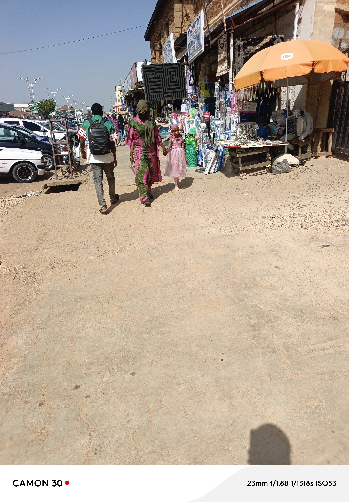 The image captures a commercial street in Jos, Nigeria, under bright daylight. The foreground is dominated by a light brown, cracked ground surface, a mix of dirt and worn concrete. A dark shadow, consistent with that of a person holding a camera, is visible in the bottom right corner. In the midground, three individuals walk away from the viewer along the right side of the street. The leftmost person is a male wearing a white shirt with green stripes on the sleeves, grey trousers, and a black backpack, with sandals on his feet. Next to him, a female, dressed in a vibrant pink and green patterned garment and a head covering, holds the hand of a young girl. The girl wears a pink dress and light-colored shoes. To the right of these individuals, a row of shops lines the street. Merchandise, including packaged items and fabrics, is displayed on racks and walls. One shop features a prominent black and white geometric pattern on its facade. An orange sun umbrella, possibly bearing an "MTN" logo, extends over a rustic wooden vendor's stall laden with various small goods. A male figure, dressed in light-colored attire, is seated at this stall. Black plastic bags are visible on the ground near the stall. On the left side of the midground, several parked vehicles, including a white sedan with black rims and a dark sedan, are visible. A small wooden ladder leans near the parked vehicles, and a drainage opening is present on the ground. The background reveals additional buildings, utility poles, streetlights, and a clear, bright blue sky, indicating an active urban environment.