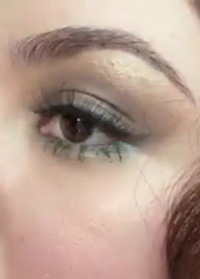 woman with styled brown hair, wearing heavy makeup, sitting in the driver's seat of a car. She looks at the camera, makes a face, sticks her tongue out, and shows her teeth. The inside of the car is visible.