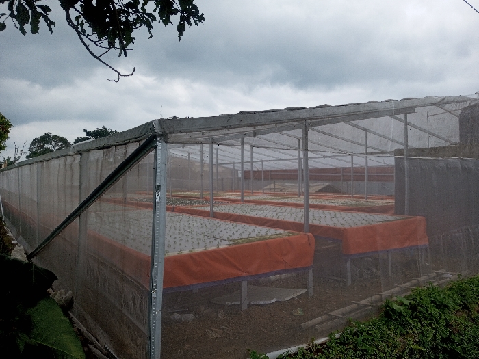 A greenhouse structure with a mesh enclosure is shown under an overcast sky. Inside are raised planting beds with orange sides. The beds are filled with rows of young plants. The greenhouse frame is made of metal, and the ground is dirt. Some vegetation surrounds the base of the structure. Tree branches are visible in the top left corner.