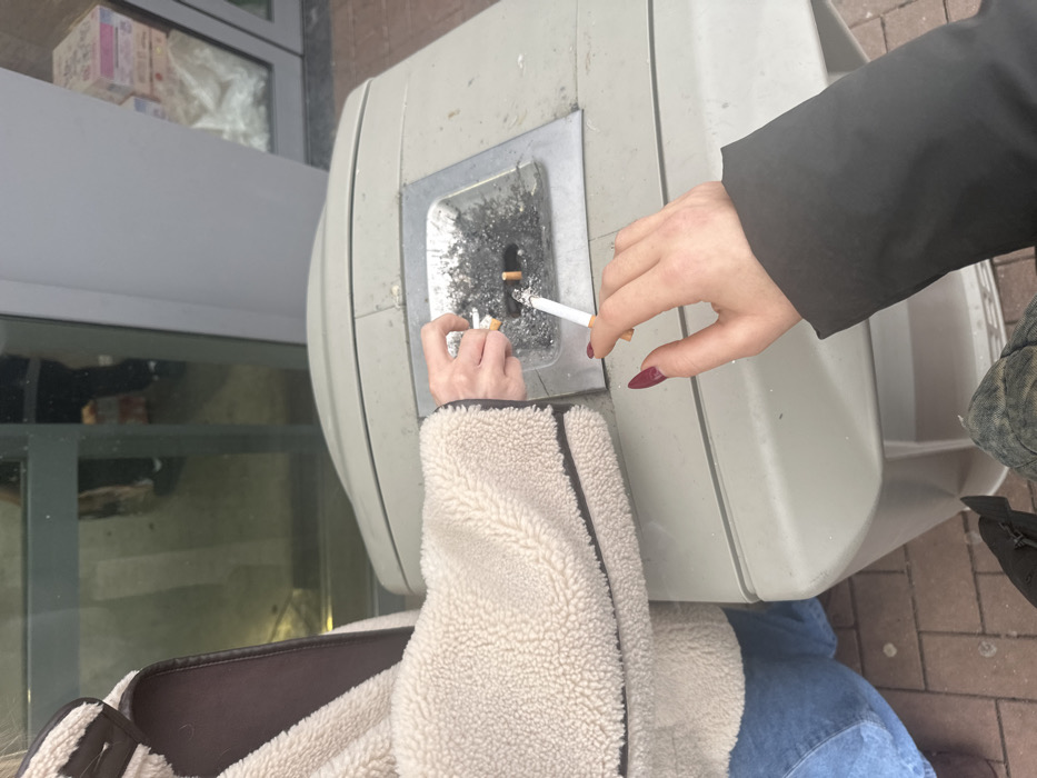 An outdoor scene in Mouscron, Belgium, depicts two individuals partially visible, interacting with a freestanding, light-grey outdoor ashtray