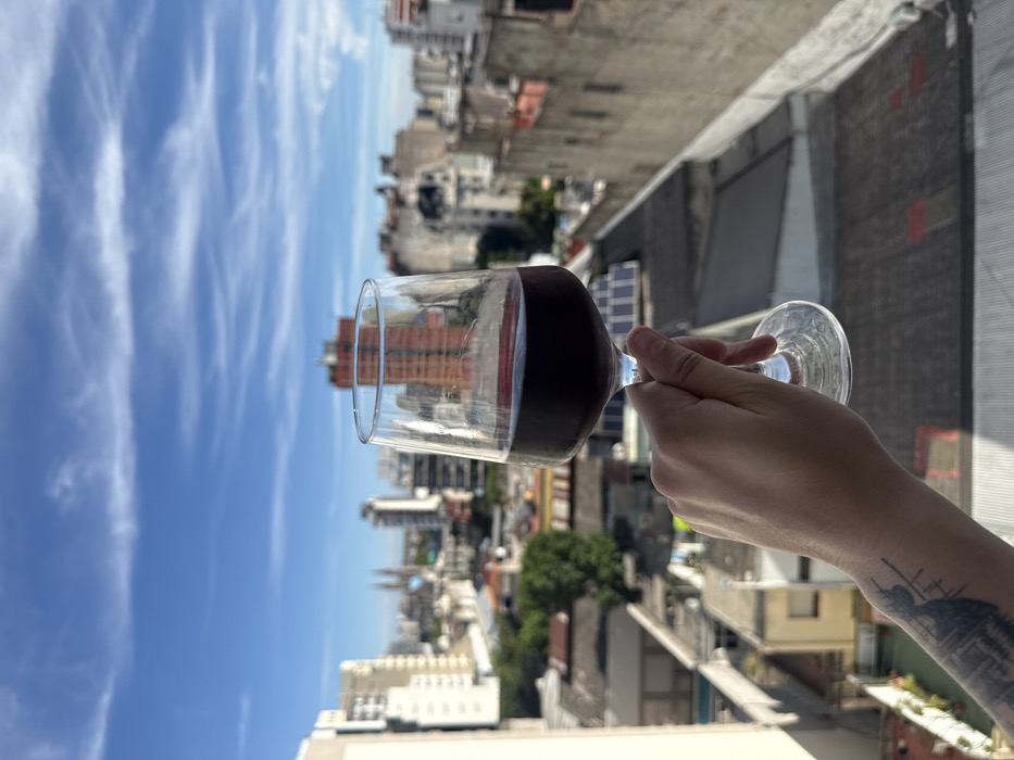 A person holds a wine glass filled with red wine, displaying the cityscape in the background. The scene is captured from a high vantage point, possibly a balcony. The sky is blue, lightly streaked with wispy clouds. The surrounding buildings vary in height and architectural style. The person's arm is visible, featuring a tattoo.