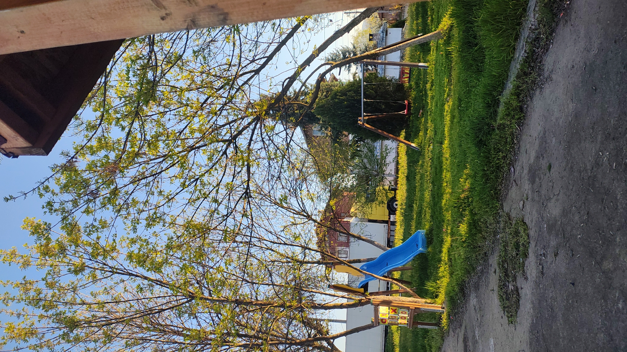 The image depicts a playground in Chepintsi, Bulgaria, featuring a blue and yellow slide, a swing set with a red swing, and a tic-tac-toe game. The playground is situated on a grassy area next to a concrete path. Trees with sparse green leaves are prominent in the foreground. In the background, a building and a white and yellow truck are visible. The sky is blue. The image appears to have been taken from under the edge of a roof.