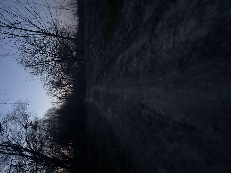 The image displays an unpaved dirt track extending into the distance, situated in Duvanlii, Bulgaria. The track appears dark and uneven. Dense, leafless deciduous trees line both sides of the path, silhouetted against a twilight sky. The sky transitions from a light blue directly overhead to a faint orange-pink hue near the horizon, indicating either dusk or pre-dawn conditions. A single, distant artificial light source is visible in the background, positioned to the left of the track and partially obscured by tree branches. No individuals, animals, or vehicles are present in the visible area. The environment is consistent with a rural or semi-rural wooded area.