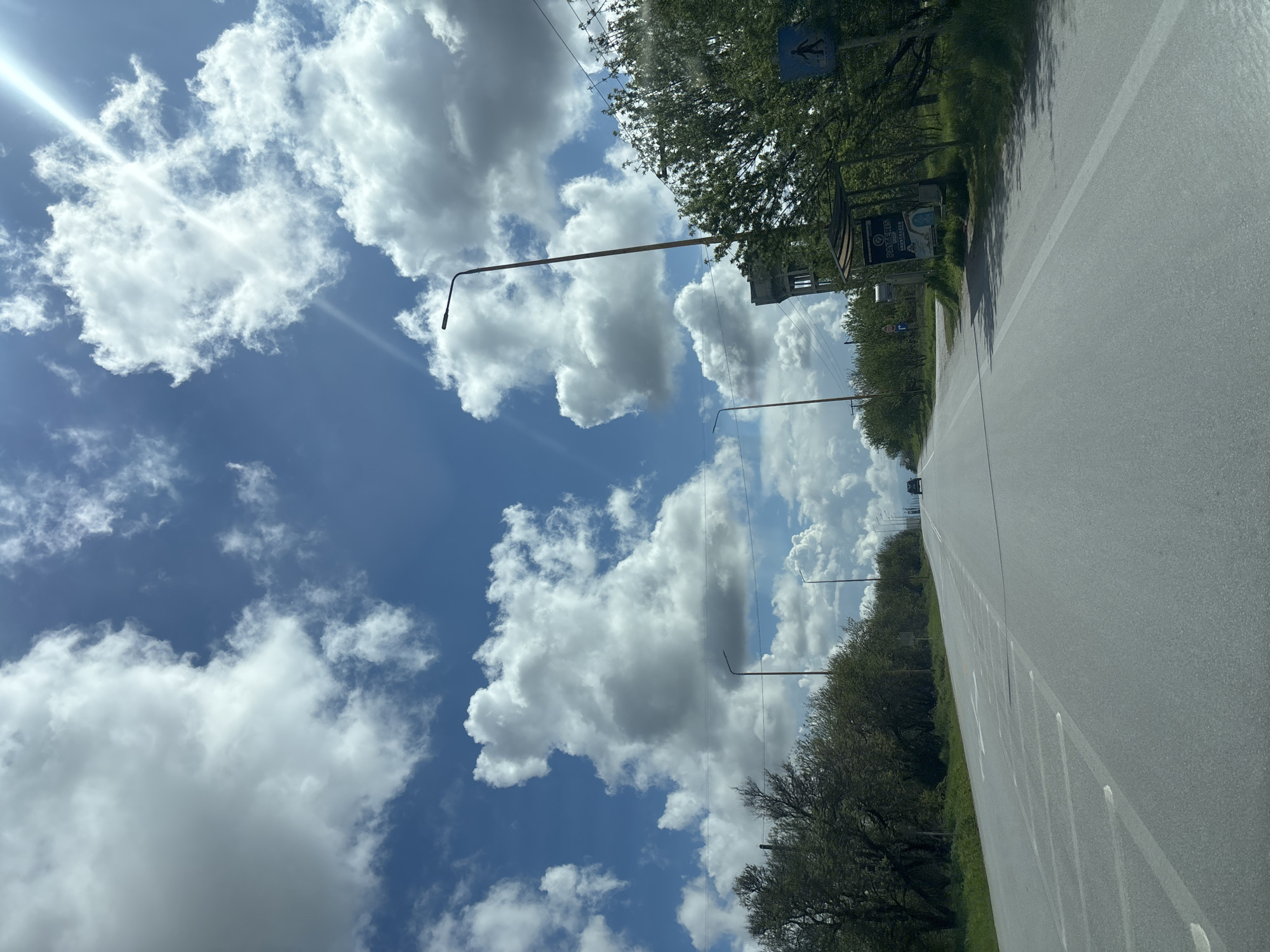The image depicts an open, two-lane asphalt road under a bright blue sky filled with large, scattered cumulus clouds, with a visible sun flare in the upper right quadrant