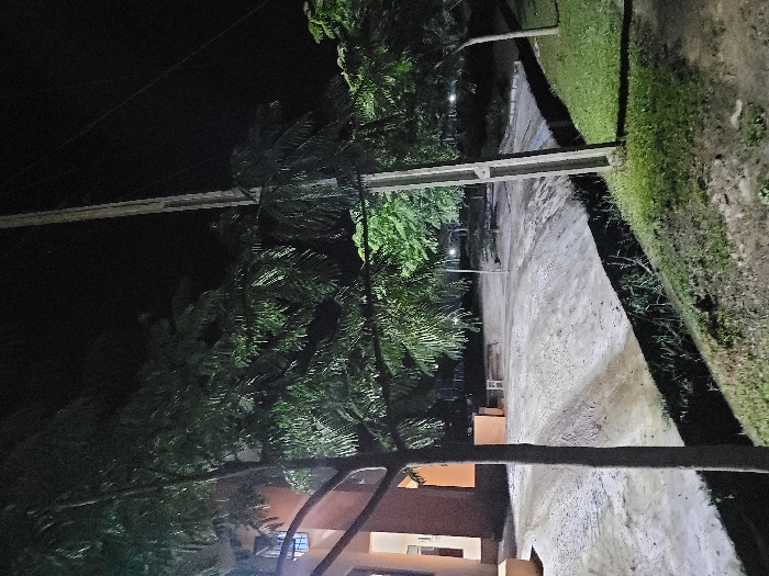 The image depicts an outdoor night scene in Abuja, Nigeria. The foreground features the trunk of a tree with green foliage on the left and a grassy embankment sloping downwards on the right, where a utility pole stands. In the midground, an unpaved, light-colored dirt path or road with visible tire-like disturbances curves from left to right. Another utility pole is positioned further right along this path, and additional trees with green leaves are present. The background on the left shows a section of a building with orange-brown and lighter walls, featuring a window with a white grid. The sky is dark, indicating nighttime, with distant artificial light sources visible in the central background. No individuals or active subjects are present. The scene is illuminated by ambient artificial light, casting some shadows.