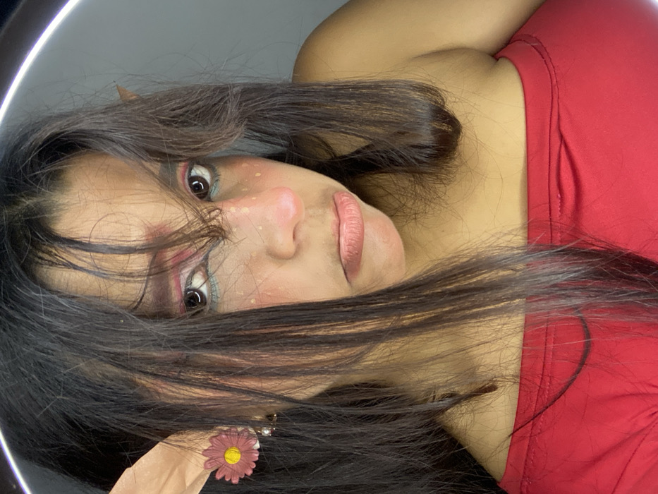 A woman with shoulder-length, dark brown hair and brown eyes, wearing a red top, looks sideways. She has fair skin with blush and freckles on her nose and cheeks. Her makeup includes pink eyeshadow and turquoise eyeliner. Her left ear has an elf-like point and is adorned with a pink flower earring. A ring light is visible in the background.