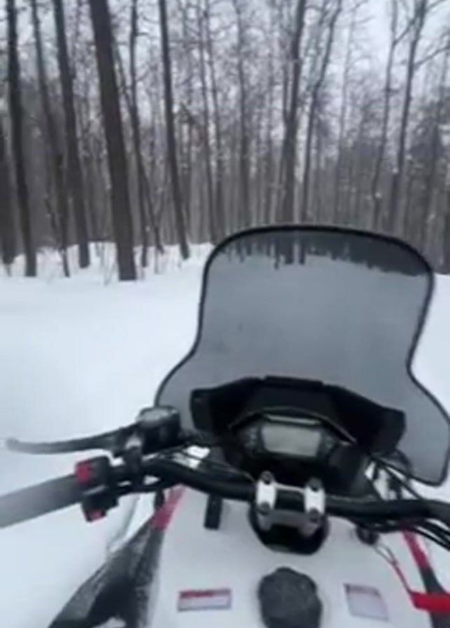 A first-person perspective video shows a snowmobile moving along a snow-covered path through a forest