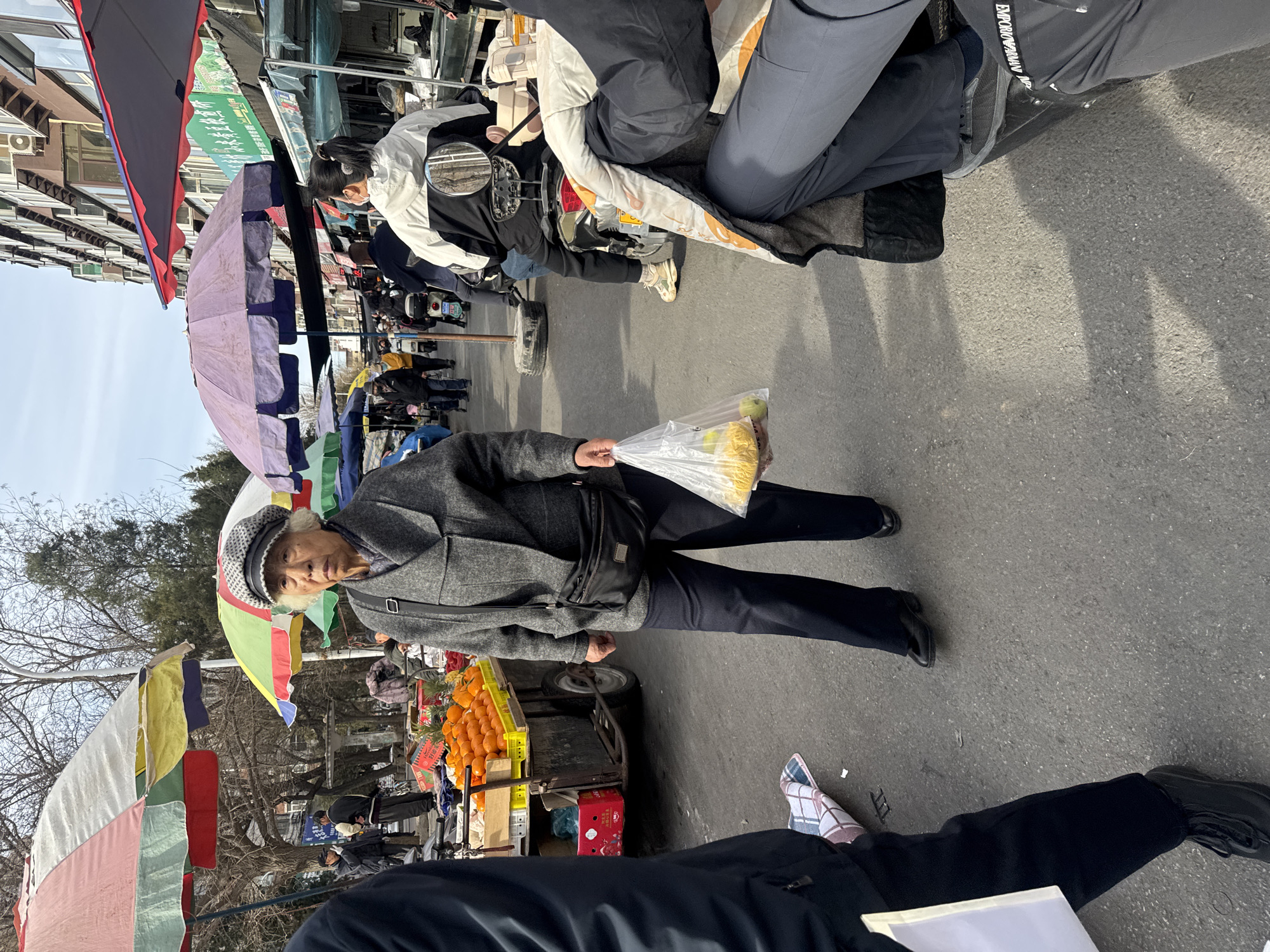 An elderly woman in a grey jacket, dark pants, and patterned hat stands on a grey asphalt road holding a clear plastic bag containing fruit. The road appears to be part of an open-air market, with stalls selling goods under colorful canopies visible in the background. One stall displays oranges. Other people are seen in the background walking along the market. A person wearing black pants and black shoes with argyle socks stands in the foreground holding a paper. The image suggests a street scene in a Chinese city, possibly Guta, China, given the context.