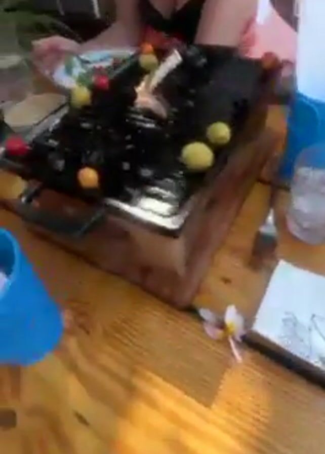 close-up of a plate with a piece of cooked meat on it. The plate has a colorful, floral design. There's a glass of dark liquid with a lemon slice and other drinks and items on the wooden table. The camera pulls back to reveal more of the table, including a grill, a salad, small bowls with condiments, and other plates. A woman is sitting at the table, and someone is holding a blue container.