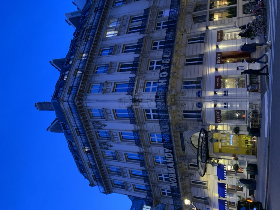 A multi-story building, "Hotel Normandy," is captured at dusk