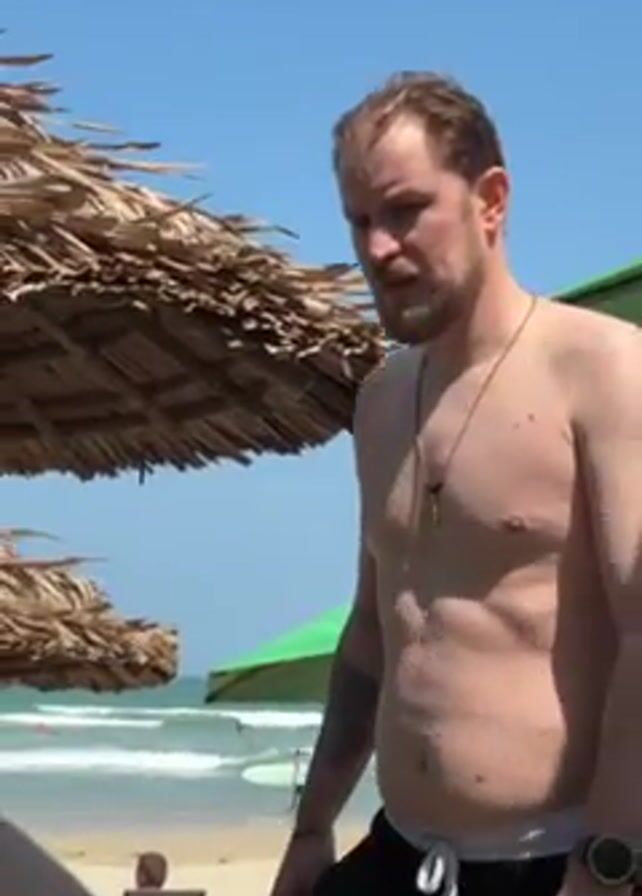 man standing shirtless on a beach. He has light skin, a short beard, and a tattoo on his left arm. He is wearing dark shorts and a necklace. He is surrounded by beach umbrellas, some with thatched roofs, and beach chairs. In the background, the ocean can be seen with a person on a surfboard. The sky is blue and clear. The camera appears to be held by someone seated on a beach chair. The man bends forward, perhaps adjusting something on a beach chair.