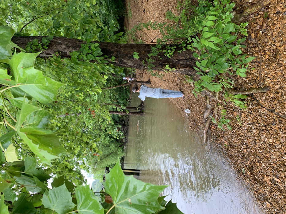 A woman stands near the water's edge wearing a light blue shirt and jeans. She appears to be taking photos or videos, holding a white object in her hand. The murky water is high, reaching the base of a tree. The ground is covered in small rocks and gravel. Lush green foliage and trees surround the scene, some leaves are close to the viewer. The water has a few ripples as if it has just started to rain.