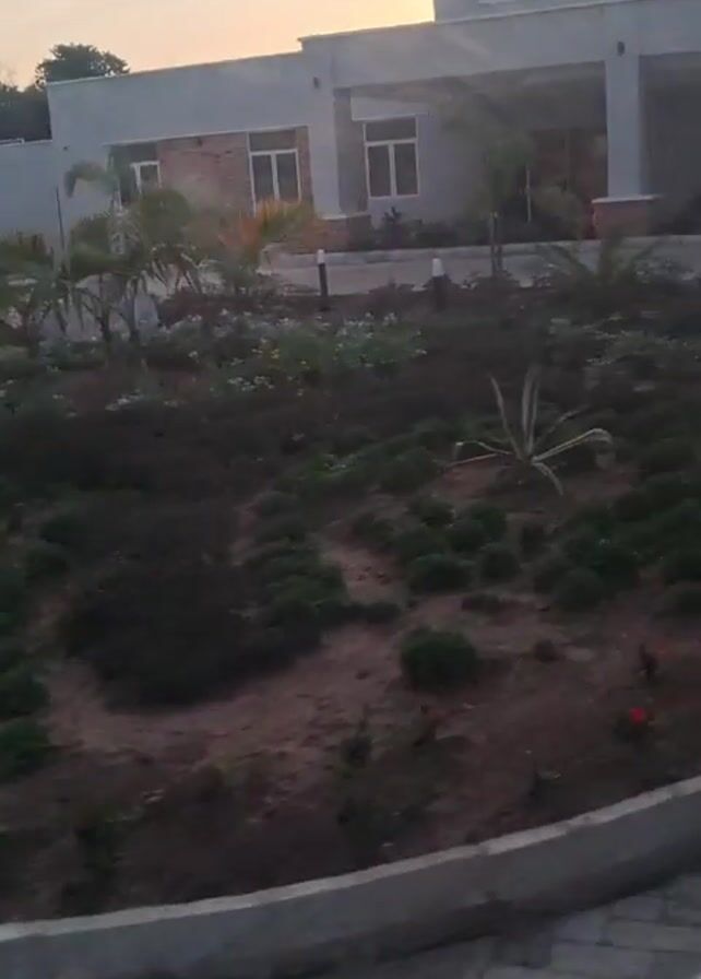 shot of the front entrance of Harmony Hotel. The building is a single-story structure with a portico supported by pillars. The hotel name, "Harmony Hotel," is displayed in large letters above the entrance. There is landscaping in front of the hotel, including bushes, small trees, and a paved driveway made of rectangular pavers. The sky is bright. The camera appears to be moving forward in a vehicle.
