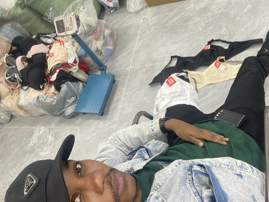 The image depicts a male individual inside what appears to be a commercial storage or wholesale facility located in Baiyun District, China. The individual, of African descent, wears a black Prada baseball cap, a light blue denim jacket over a dark green t-shirt, black trousers, and a black wristwatch on his left wrist. A black, multi-port device is clipped to his right thigh. He is looking directly at the camera, holding what appears to be a phone to take a selfie. To the right of the individual, on the light grey tiled floor, three brassieres (one white, one beige, one black), each with visible tags (one white tag reads "Classic Dormir" and "8"), are laid out. Further in the background, a substantial pile of assorted clothing, predominantly bras in various colors such as black, pink, and beige, is visible, some contained within clear plastic bags. Adjacent to this pile is a blue industrial weighing scale with a digital display unit and keypad, indicating the processing of bulk items by weight. The floor is composed of large, light grey rectangular tiles with darker grout lines. The scene suggests a wholesale or logistics operation involving garments.