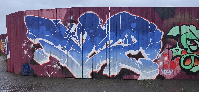 A section of a maroon wooden fence displays vibrant graffiti. The main artwork features large, stylized blue letters with white outlines and shiny highlights. The blue fades from dark at the top to a lighter shade towards the bottom. To the right is another piece of graffiti, mainly green and red, with a cartoonish character. The ground in front is wet asphalt. Other graffiti is visible further down the fence line.