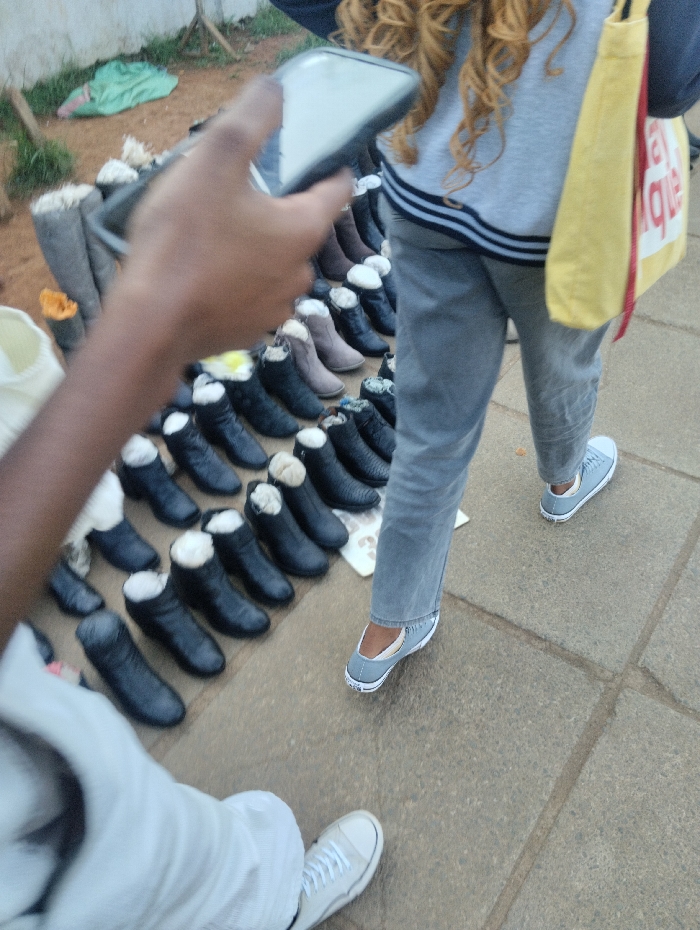 The image captures an outdoor street vending scene in Hospital ward, Kenya. In the foreground, a dark-skinned right hand holds a black smartphone, with the photographer's lower body, dressed in light-colored trousers and white sneakers, visible at the bottom left. A second individual, seen from behind, walks from right to left across the mid-ground. This person has long, wavy, light brown hair, wears a grey long-sleeved top with striped details, grey trousers, and light grey sneakers, and carries a yellow tote bag with red lettering. Arranged on the ground is a display of numerous boots, predominantly dark-colored (black and dark grey), with several pairs featuring light-colored inner linings. A few brown boots and one orange item are also present within the display. The ground transitions from exposed dirt on the left, where a light-colored wall and green fabric are visible in the background, to a paved surface of large concrete slabs on the right.