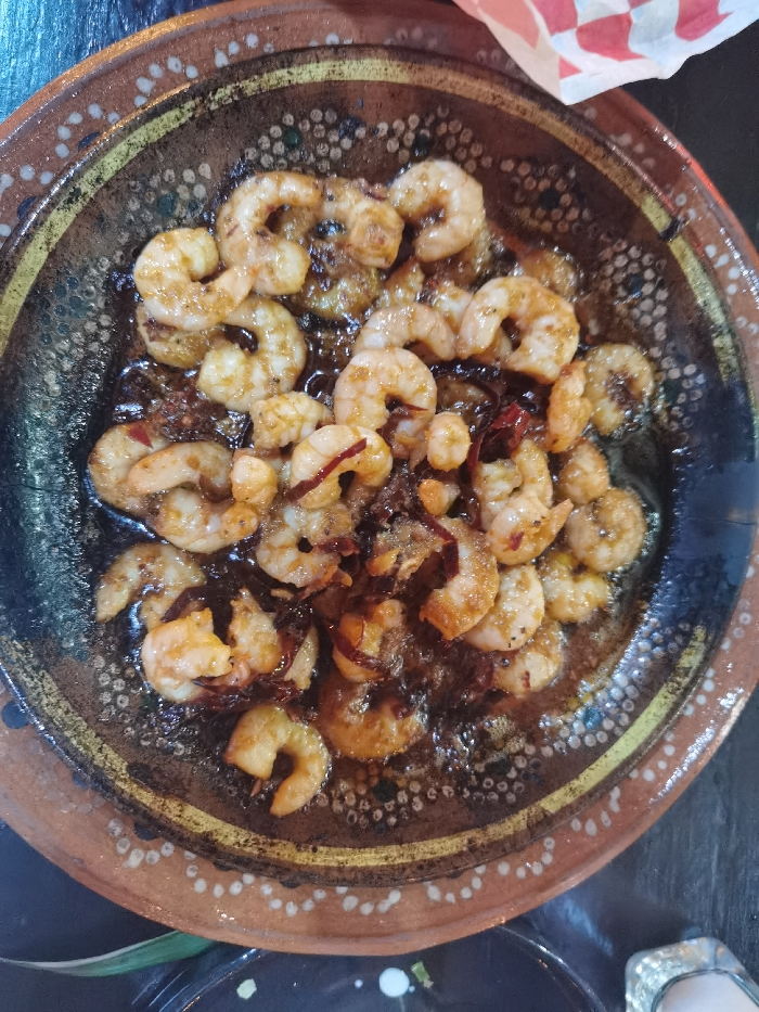 plate of cooked shrimp in a terracotta dish with a decorative brown and white rim. The shrimp are arranged in a single layer, appearing to be seasoned with spices, possibly garlic and paprika. The dish is sitting on a black table. The location is Playa del Carmen, Mexico, at the coordinates 20.631, -87.089. It appears to be a close-up of a meal at a restaurant or private residence.
