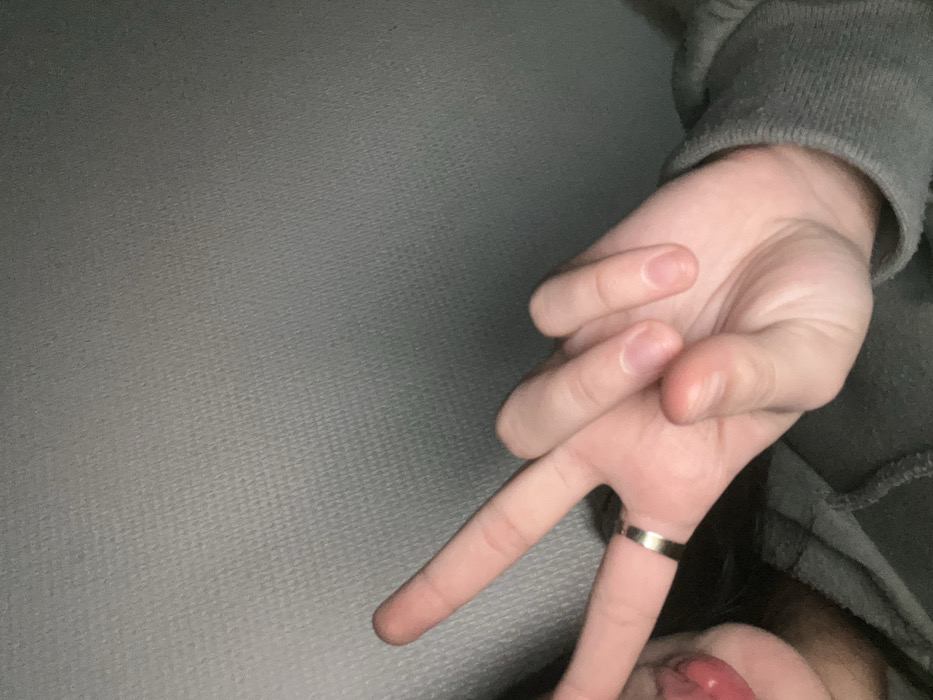 The image presents a close-up view of a subject's left hand and the lower left portion of their face against an indistinct, textured, light gray background. The left hand is positioned in the center, forming a "peace" sign with the index and middle fingers extended upwards, while the ring finger, pinky, and thumb are folded. A plain, silver-colored band ring is worn on the extended index finger. A gray, ribbed fabric cuff, consistent with a long-sleeved garment such as a sweatshirt, is visible around the subject's wrist and lower arm. In the bottom left quadrant, the lower part of a face is visible, with the mouth open and a pink tongue extended. The environment provides no visual cues to ascertain a specific location within the city of Strasbourg, France.