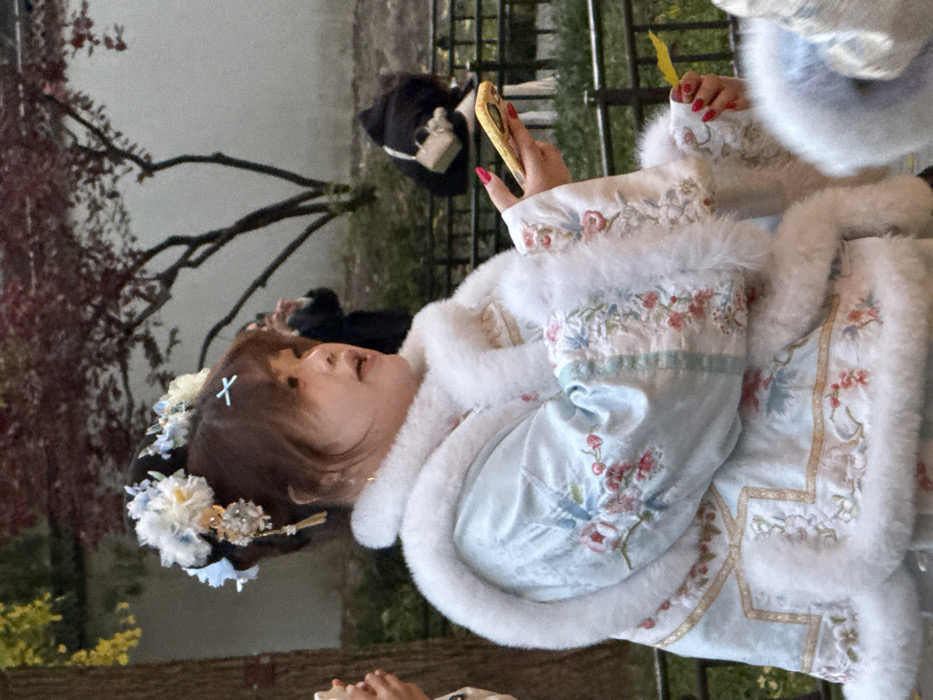 An East Asian female subject is centrally depicted outdoors in Xicheng District, China, facing right with an open mouth, suggesting vocalization. Her hair is styled in an elaborate updo, accessorized with light blue and white floral ornaments, gold-toned filigree, and a distinct light blue 'X' clip. She wears a light blue, long-sleeved garment, likely a Hanfu-style coat, adorned with multi-colored floral embroidery in pink, red, blue, and green, and thick white fur trim along the collar, cuffs, and front opening. Gold-colored hoop earrings are visible. Her right hand, featuring red manicured nails, holds a yellow-cased smartphone horizontally. Her left hand holds a small yellow leaf. To the subject's immediate left, hands holding a white smartphone are partially visible. In the background, a dark-clad individual operates a smartphone, presumably photographing or recording. A tree with sparse reddish-brown foliage is visible against a light-colored wall. A black metal fence bisects the mid-ground. Another dark-clad individual is partially visible behind the fence on the right. Ambient lighting suggests an outdoor daytime setting.