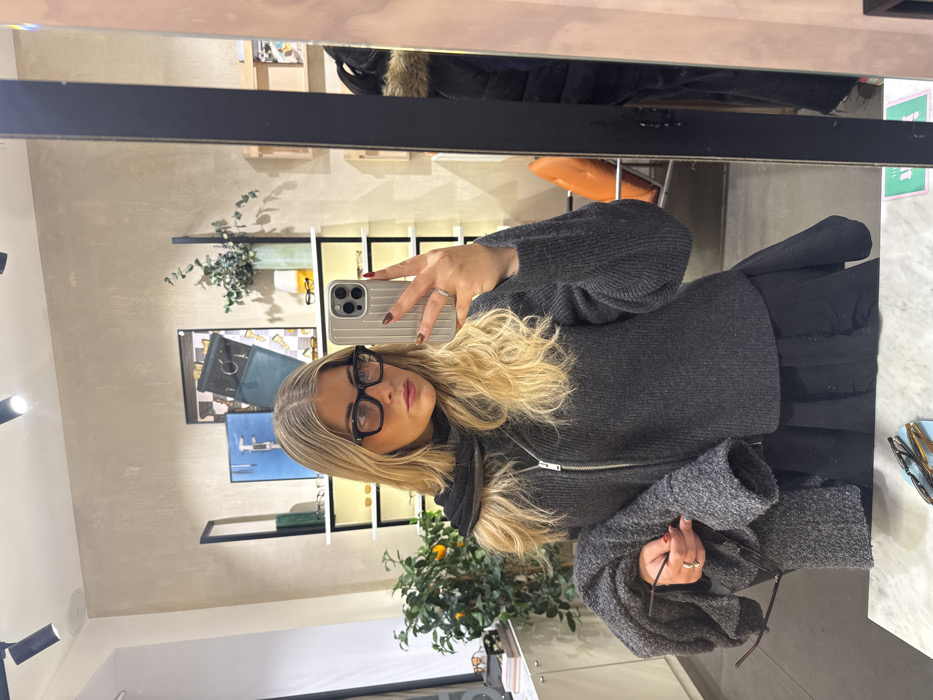 A woman with long blonde wavy hair wears black eyeglasses and a dark gray textured sweater with a zipper. She holds a smartphone with a grooved silver case in her right hand, taking a mirror selfie in a retail space. The mirror reflects displays of eyeglasses and wall decorations. The backdrop includes a plant with small orange fruits and recessed lighting.