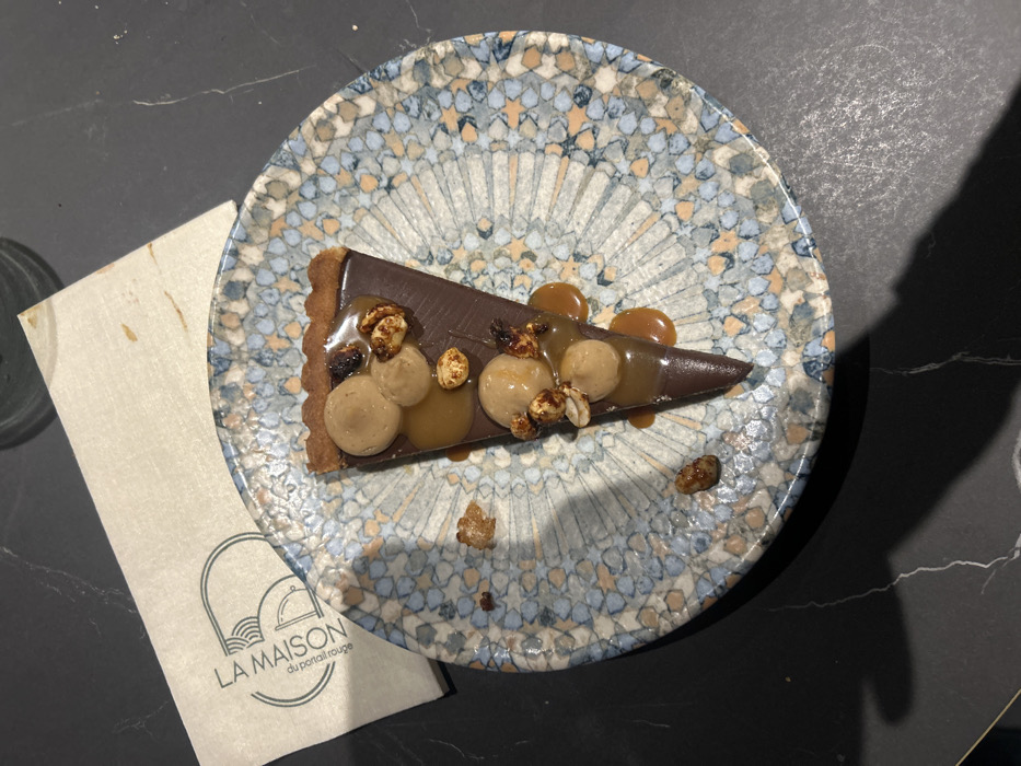 A triangular slice of chocolate tart with a dark brown fluted crust is centrally presented on a round, ceramic plate featuring an intricate, radial geometric pattern in blues, beiges, and muted orange-browns. The tart is adorned with multiple spherical dollops of light brown cream or mousse, a glossy caramel drizzle, and clusters of roasted nuts, some appearing to be peanuts or small popcorn kernels. Scattered crumbs of these toppings rest on the plate. To the upper left, a cream-colored, folded paper napkin with minor stains displays a logo: "LA MAISON" in large type, "du portail rouge" below it, and an abstract architectural graphic above. This napkin identifies the establishment as La Maison du Portail Rouge, located at 23 Rue du Portail Rouge, 42000 Saint-Étienne, France. The plate and napkin rest on a dark, possibly black, surface with subtle white marbling or veining. Overhead lighting casts distinct shadows from the plate and tart onto the table. No individuals are visible in the frame.