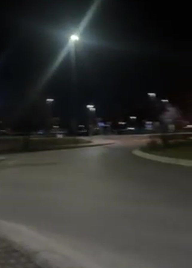 A short video taken at night shows a street and surrounding area lit by streetlights