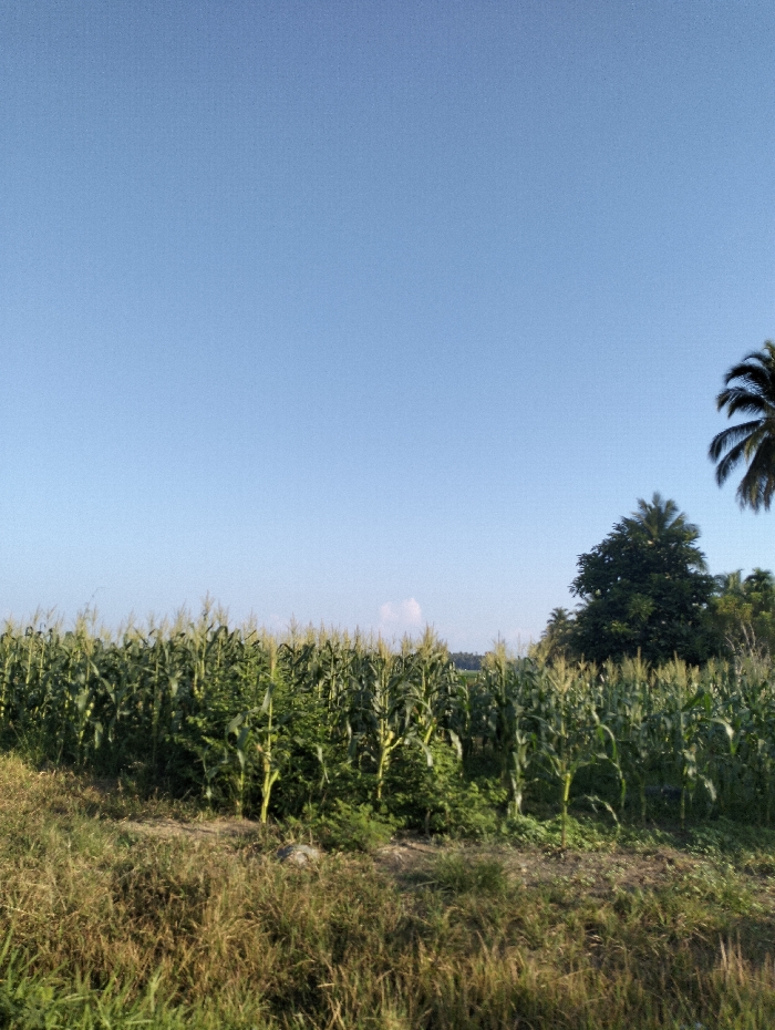 A vibrant cornfield stands tall under a vast, clear blue sky. Lush green stalks stretch across the landscape, hinting at a bountiful harvest. Grassy ground in the foreground meets the base of the crops. In the distance, clusters of trees, including a palm, dot the horizon, adding depth to the scene. The overall impression is one of natural beauty and agricultural abundance.