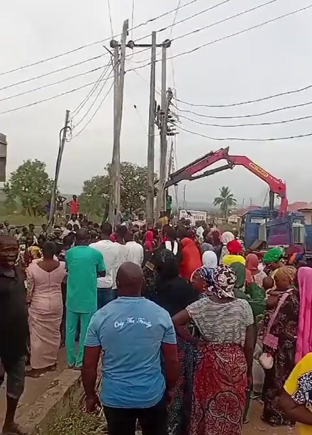 A crowd of people, predominantly women, are gathered near power lines and utility poles. A red crane truck is operating in the background. Many of the women are wearing colorful traditional clothing and head coverings. The power lines are overhead, and some people are standing on a rooftop for a better view. The sky is overcast.