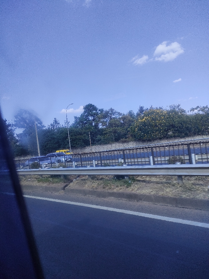 A view from a moving vehicle shows a multi-lane highway separated by a metal barrier. Beyond the barrier, a higher road is visible with cars and possibly a yellow bus. Trees line the horizon with a blue sky overhead. A lone cloud floats in the distance. The road is dark, and the sky is bright. The perspective is low, capturing the road ahead and the scenery passing by.