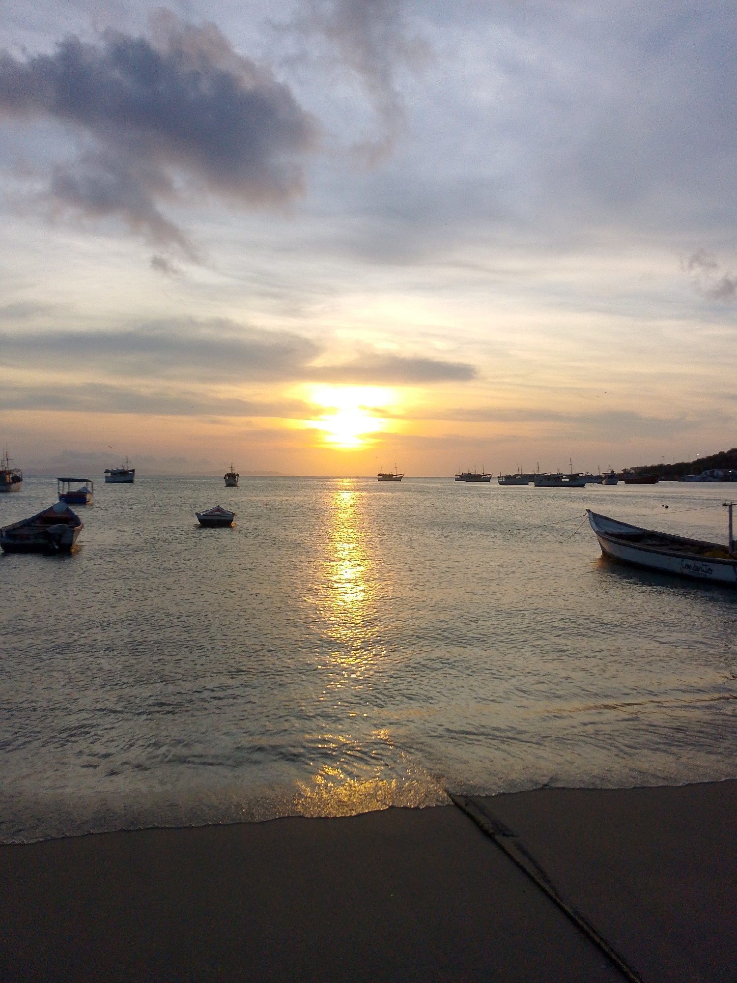 The image depicts a sunset scene in Juan Griego, Venezuela, featuring a beach and a body of water with several boats