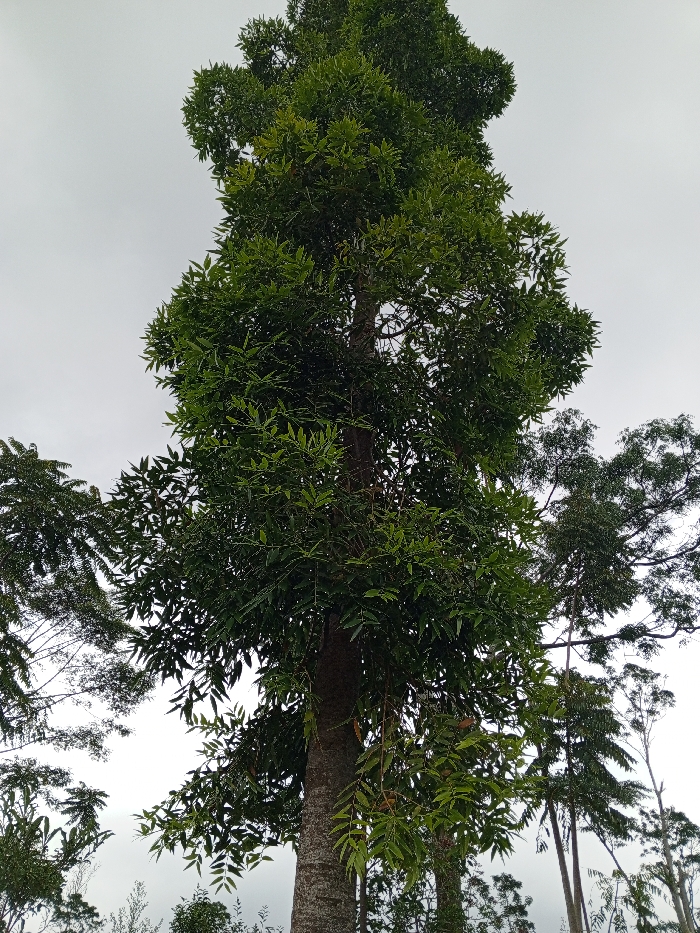 In the city of Unknown, Unknown, a tall, slender tree with dense, vibrant green foliage occupies the majority of the frame, extending vertically against an overcast white-gray sky. Its rough, grayish-brown trunk is visible at the lower center, ascending into a tightly packed crown of small, elongated leaves. To the left, a portion of another tree's canopy with finer, darker green leaves is partially visible. On the right, several other slender trees with less dense foliage stand against the sky, their lighter green canopies contrasting with the main tree. No individuals, actions, or specific objects beyond the trees and sky are present. The lighting is diffuse, indicating an overcast condition.