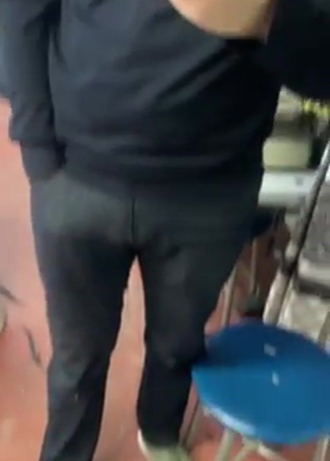 A person stands in front of a mirror. The person wears black pants and light green shoes, and stands on a brown floor with a decorative rug in the foreground. As the camera rises, the reflection in the mirror shows a man wearing a black, long-sleeved, zippered mock turtleneck. He holds a white cellphone in front of his face. Behind him, clothes are hung on a rack. The lighting appears to be bright, and the setting resembles an interior space.