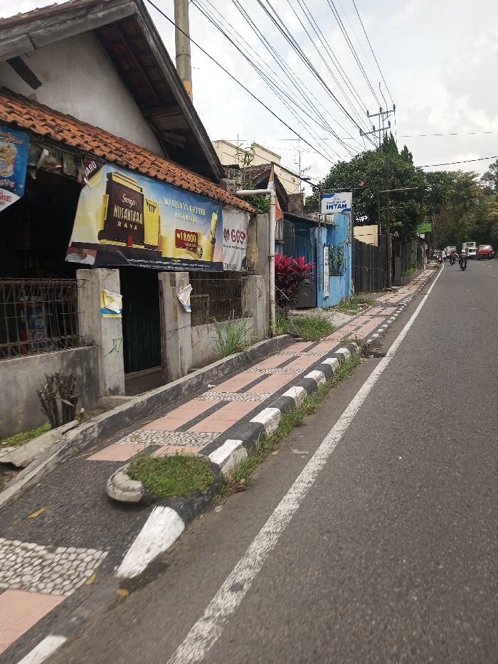 The image depicts an urban street scene in Khajuripada, India, under an overcast sky. A two-lane asphalt road occupies the right side of the frame, marked by a solid white line separating the traffic lane from the curb. Adjacent to the road on the left is a paved sidewalk, featuring a pattern of reddish-brown and grey rectangular tiles, bordered by a curb painted with black and white stripes. Patches of green grass grow on and around the curb. On the left, a building with a brown tiled roof and a light-colored facade is visible. A large banner, primarily brown and gold, advertising "Surga Nusantara Raya" and "Maksimalnya Kretek" with a price of "Rp 18.000", hangs horizontally from its eaves. Below this, a smaller banner marked "GGS" is also attached. The building features a dark entryway or gate. Further along the street on the left, a blue-painted structure with a white sign displaying "INTAN" is visible, fronted by vibrant red foliage. Multiple power poles with an intricate network of overhead electrical wires stretch across the sky. In the distant background on the right side of the road, several individuals on motorcycles are observed traveling away from the viewer, alongside what appears to be a larger commercial vehicle. Abundant green trees line the street in the background.