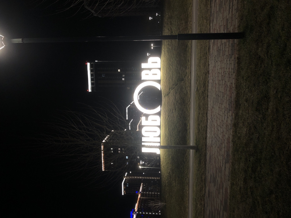 A nighttime scene shows the illuminated word "Любовь" (Love in Russian) standing vertically in a park