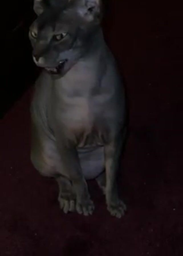 - "A gray Sphynx cat is sitting on a reddish-purple carpet" by FM-QhCsg2, licensed under CC BY 4.0