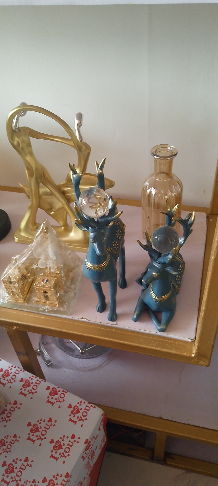 The image displays a detailed view of decorative objects arranged on a shelf within an interior space in Warri, Nigeria. The shelf is light-colored and supported by a golden-colored metal frame, visible on the right and below. On the left side of the shelf, a golden abstract sculpture featuring two entwined figures is prominently displayed. Adjacent to it, two small golden replicas of the Arc de Triomphe are visible under clear plastic wrapping, positioned next to a clear, roughly pyramidal object. Centrally located are two dark teal deer figurines, both with golden accents on their antlers and bodies. One deer stands upright, holding a clear crystal sphere containing a golden human-like figure above its head. The second deer is in a reclining pose, also supporting a crystal sphere with its antlers. To the far right, an amber-tinted, vertically ribbed glass bottle stands. The background behind the shelf is a plain, light-colored wall. Partially visible below the shelf on the bottom left is a white box adorned with red 'I LOVE YOU' text and heart patterns.