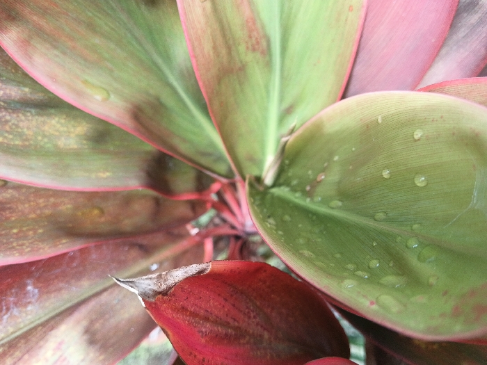 A close-up shot presents a cluster of vibrant leaves in hues of red, green, and pink. Water droplets adorn the surface of a large, light green leaf, capturing the light. The edges of the leaves are highlighted with a delicate pink outline. A single red leaf in the foreground displays a dry, brown tip, contrasting with the healthy foliage around it. The overall composition showcases the plant's textures and colors.
