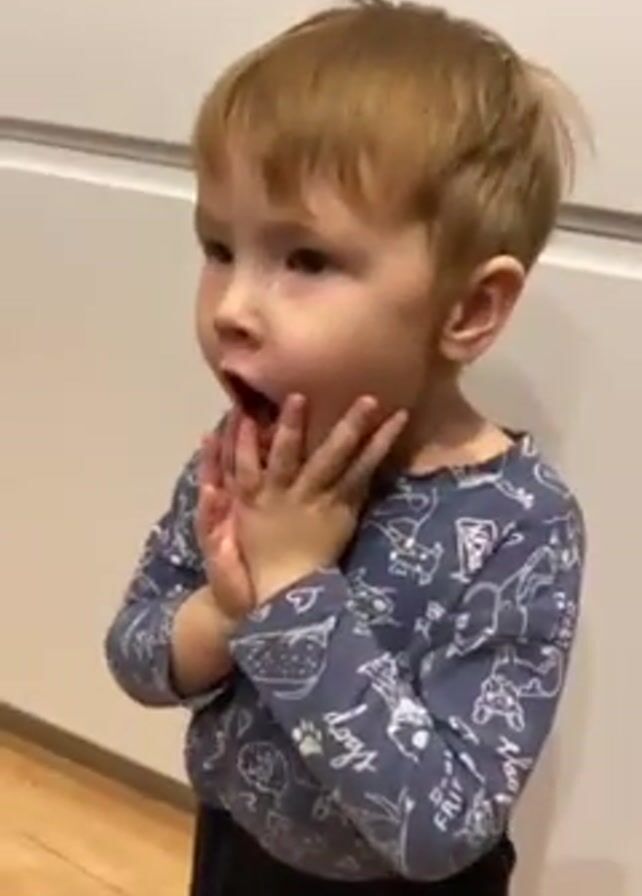 A young boy with light brown hair and wearing a long-sleeved gray shirt with a print is standing in a room, likely a kitchen. He first opens his mouth wide and gestures with his hands. Then he places his hands together and touches them to his chin. The background consists of a light-colored wall and possibly kitchen cabinets. An audio track can be heard, though the content is indecipherable.