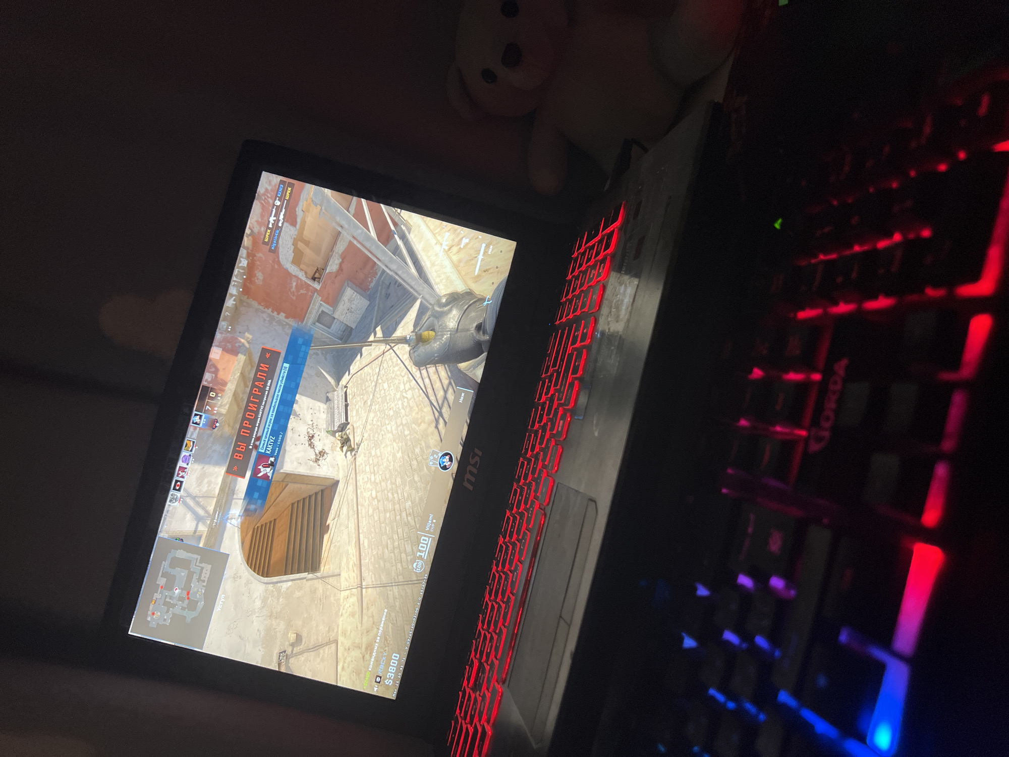 Here's a description of the image: A first-person shooter video game, Counter-Strike: Global Offensive, is displayed on an MSI laptop screen. The game scene appears to be in a Mediterranean-style setting with stone walls and structures. The game interface elements like the player's health, money ($3800), and a mini-map are visible. The text "YOU LOST" is displayed in Russian ("ВЫ ПРОИГРАЛИ"). The laptop has a red-backlit keyboard. An external keyboard with blue and red lighting is partially visible to the right of the laptop. A stuffed bear is situated behind the laptop. There are no discernible individuals. The lighting suggests a dim environment. There is no evidence of Shushary, Russia.