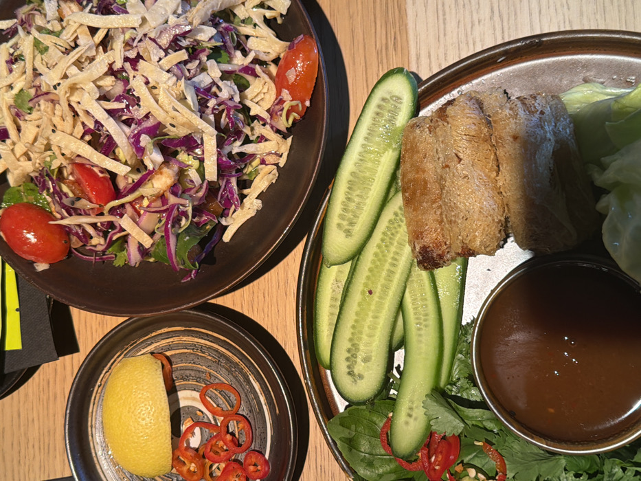 The image displays a meal set on a light-colored tabletop in a restaurant located in Kiryat Ono, Israel. No individuals are visible. The scene features three distinct plates of food. In the upper left, a small, dark ceramic plate holds a yellow lemon half and several thin, circular slices of red chili peppers. To its right, a larger, dark ceramic bowl contains a salad consisting of shredded red cabbage, green leafy vegetables, multiple red cherry tomato halves, black sesame seeds, and crispy yellow tortilla-like strips. In the lower portion of the image, a large, dark ceramic plate with a lighter rim presents a variety of items: several long, sliced green cucumbers, a mound of fresh green herbs (likely cilantro and basil) intermixed with small red chili pieces, a small silver bowl filled with a dark brown dipping sauce, and three golden-brown, cylindrical fried spring rolls or similar items stacked atop light green lettuce leaves. A dark napkin or menu is partially visible in the distant background.
