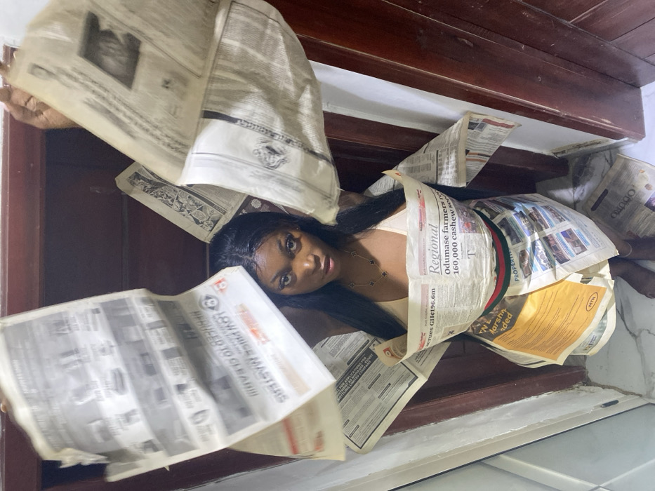 The image features a young adult female standing indoors within a narrow architectural space, likely a doorway or alcove, in Joma, Ghana. She has dark skin and long, dark hair, presenting a neutral expression while looking directly at the camera. She wears a light-colored top and a necklace adorned with black four-leaf clover motifs. Numerous sheets of newspaper are prominent; some are held aloft by hands positioned above her head, while others are fashioned into a skirt around her torso and legs. A green and red striped band, possibly a belt, cinches the newspaper skirt at her waist. Visible newspaper headlines include "Daily Graphic" and a report concerning "Odumase farmers re 160,000 cashew seeds." Additional loose newspaper sheets are scattered on the light-colored floor. The immediate environment includes a dark wooden frame on the right and a lighter wall or surface on the left, with an indistinct, darker background behind the subject.