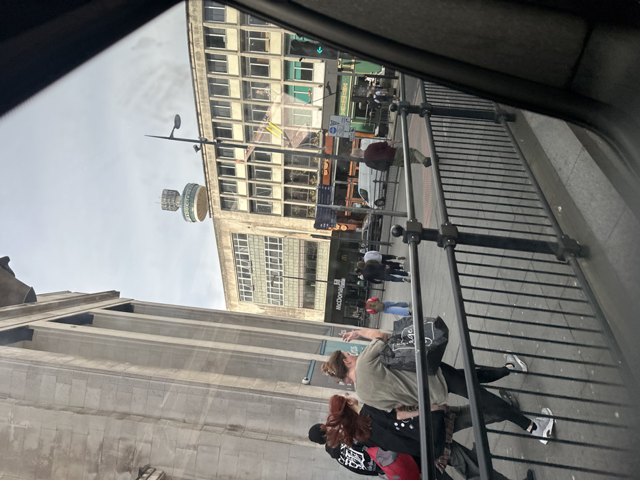 The image is taken from inside a vehicle looking out at the street. It shows a group of people walking on a sidewalk in front of a brick building. The building has a "McDonald's" sign, and there are several other businesses visible on the ground floor. A large, white van is parked on the street, and other vehicles are visible in the distance. The street is lined with black railings. The Radio City Tower can be seen in the background. The image was taken on the corner of Paradise Street and Dale Street, Liverpool. The coordinates 53.405, -2.979 are the location of this intersection in Liverpool.