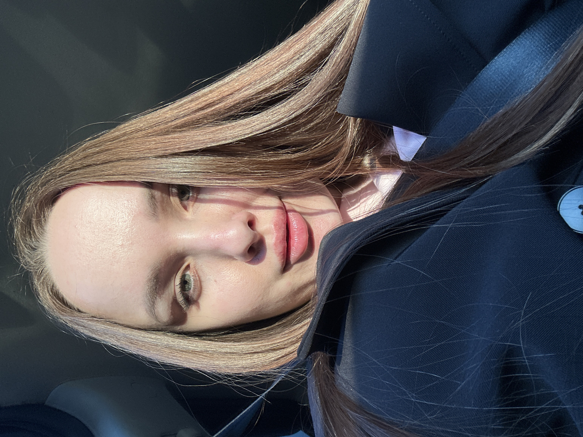 A woman with long, straight, light brown hair is shown in a close-up portrait. She has fair skin, green eyes, and full lips. She is wearing a dark blue blazer with a white collared shirt underneath. A seatbelt is visible across her shoulder. The lighting is bright, with sunlight illuminating her face and hair. The background is indistinct, suggesting she is indoors, possibly in a car.