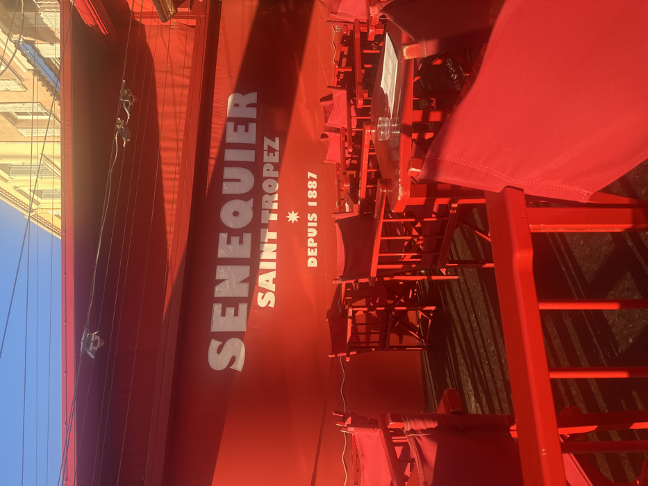 The image displays the outdoor seating area of Sénéquier café in Saint-Tropez, France