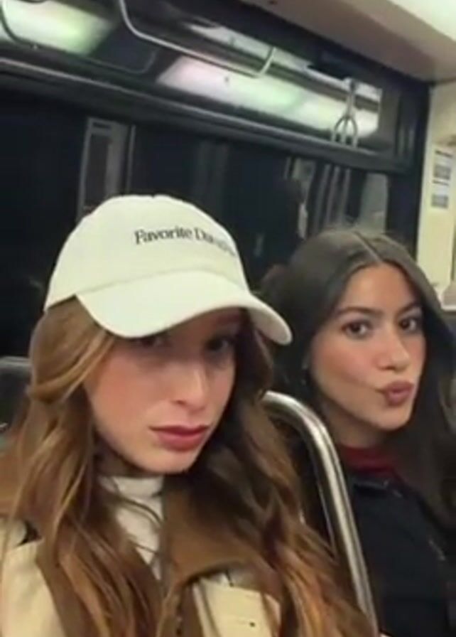 Two women are on a train. The woman on the left has long reddish-brown hair and is wearing a white baseball cap that says "Favorite Daughter." She's also wearing a beige coat. The woman on the right has long brown hair and is wearing a black jacket. They are both looking at the camera. The woman on the left makes a kissing face and the woman on the right winks. Other passengers can be seen in the background.